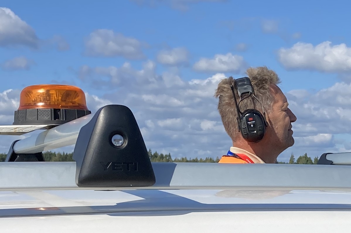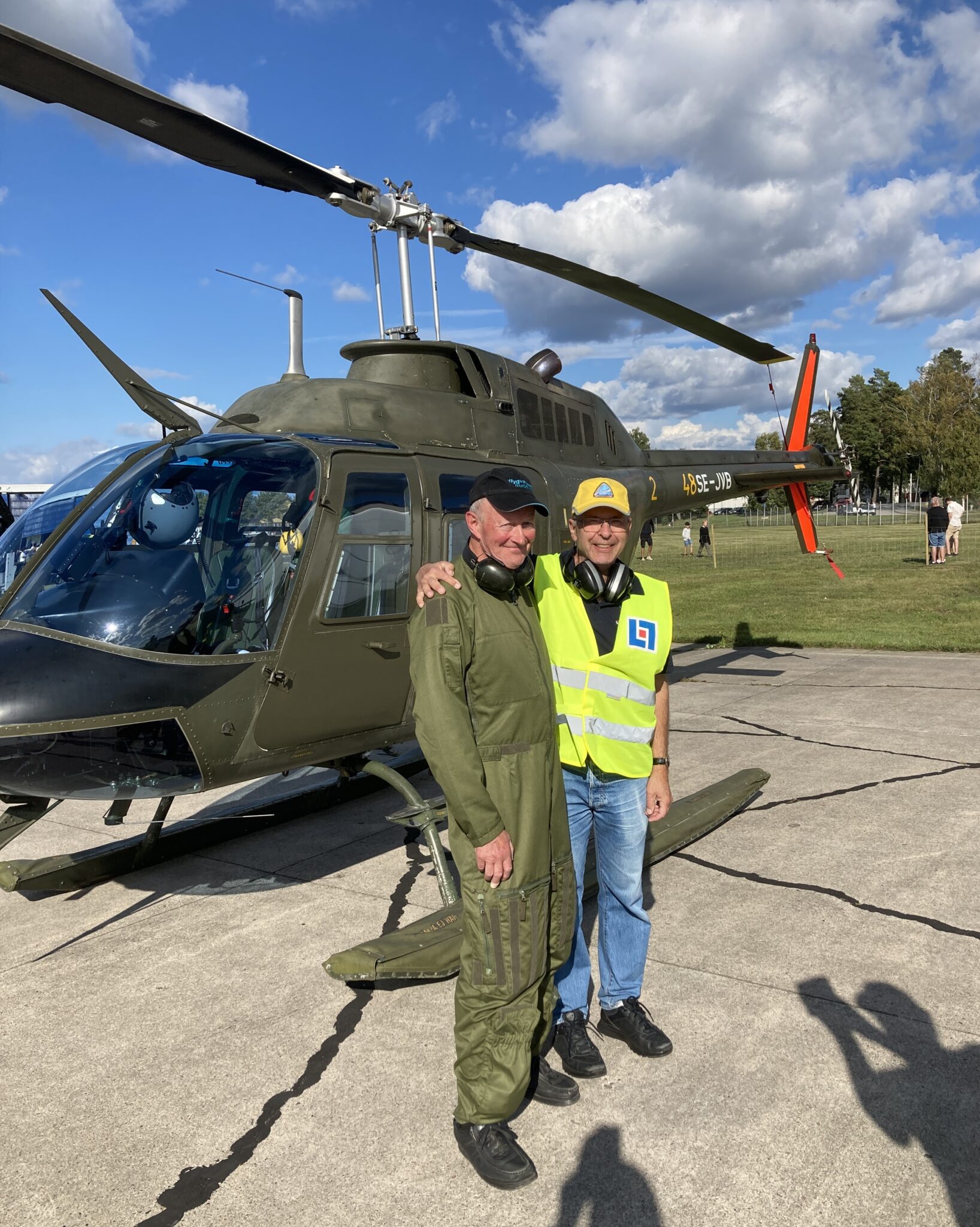 Den glada Hkp 6-piloten – och -mekanikern – Rolf Gauffin med (lika glada) SFF-styrelsens Richard Evers – för dagen assisterande airside-koordinator under vaksam ledning av Skavstas Safety Manager Johan Axby.