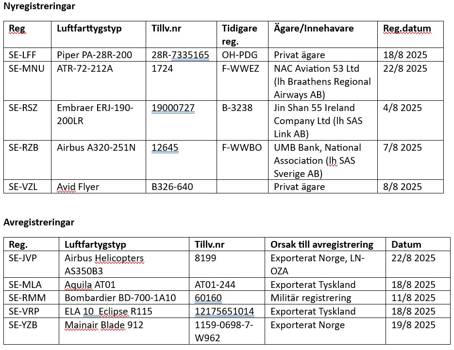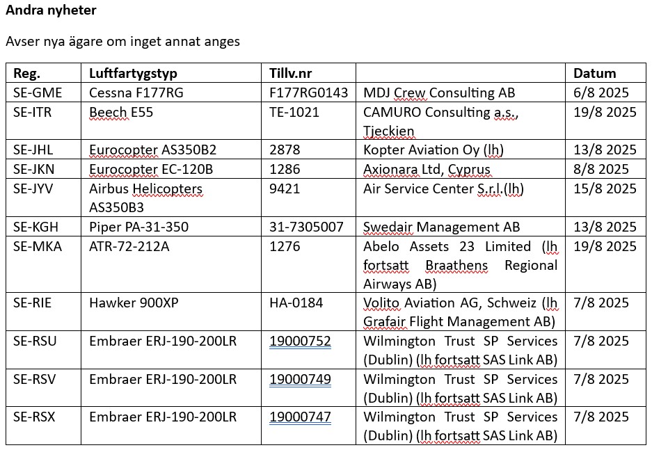 Informationen baseras som vanligt på uppgifter från Transportstyrelsen om nyregistreringar, avregistreringar och förändringar i ägare/innehavare under den här månaden. Ifall ingen innehavare anges, saknas uppgift eller så avses privatperson(er). Ändringar i ägande och/eller innehav mellan privatpersoner finns ej heller med. TS-information har kompletterats med information som finns tillgänglig på internets olika hemsidor och andra källor som till exempel Air Britain News, Scramble, SFF Forum, Aerodata, CH-Aviation, Flightradar24, Fokker News, Civil-Spotters, Rotorspot, Wikipedia etc.  Tidigare registreringar anges i ordningsföljden senaste först. Förkortningen Ih (leaseholder) betyder innehavare.