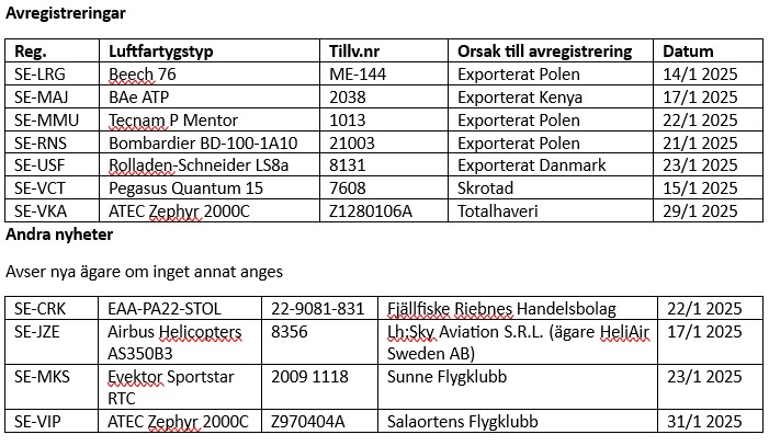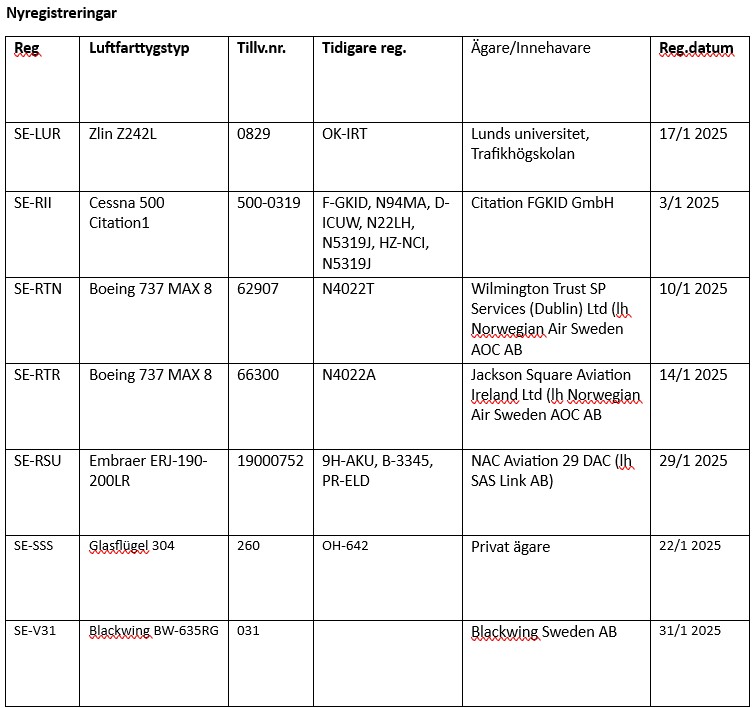 Informationen baseras som vanligt på uppgifter från Transportstyrelsen om nyregistreringar, avregistreringar och förändringar i ägare/innehavare under den här månaden. Ifall ingen innehavare anges, saknas uppgift eller så avses privatperson(er). Ändringar i ägande och/eller innehav mellan privatpersoner finns ej heller med. TS-information har kompletterats med information som finns tillgänglig på internets olika hemsidor och andra källor som till exempel Air Britain News, Scramble, SFF Forum, Aerodata, CH-Aviation, Flightradar24, Fokker News, Civil-Spotters, Rotorspot, Wikipedia etc. Tidigare registreringar anges i ordningsföljden senaste först. Förkortningen Ih (leaseholder) betyder innehavare.