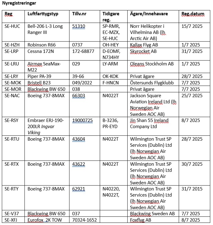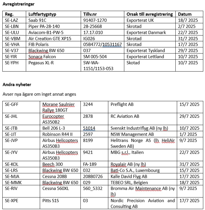 Informationen baseras som vanligt på uppgifter från Transportstyrelsen om nyregistreringar, avregistreringar och förändringar i ägare/innehavare under den här månaden. Ifall ingen innehavare anges, saknas uppgift eller så avses privatperson(er). Ändringar i ägande och/eller innehav mellan privatpersoner finns ej heller med. TS-information har kompletterats med information som finns tillgänglig på internets olika hemsidor och andra källor som till exempel Air Britain News, Scramble, SFF Forum, Aerodata, CH-Aviation, Flightradar24, Fokker News, Civil-Spotters, Rotorspot, Wikipedia etc.  Tidigare registreringar anges i ordningsföljden senaste först. Förkortningen Ih (leaseholder) betyder innehavare.
