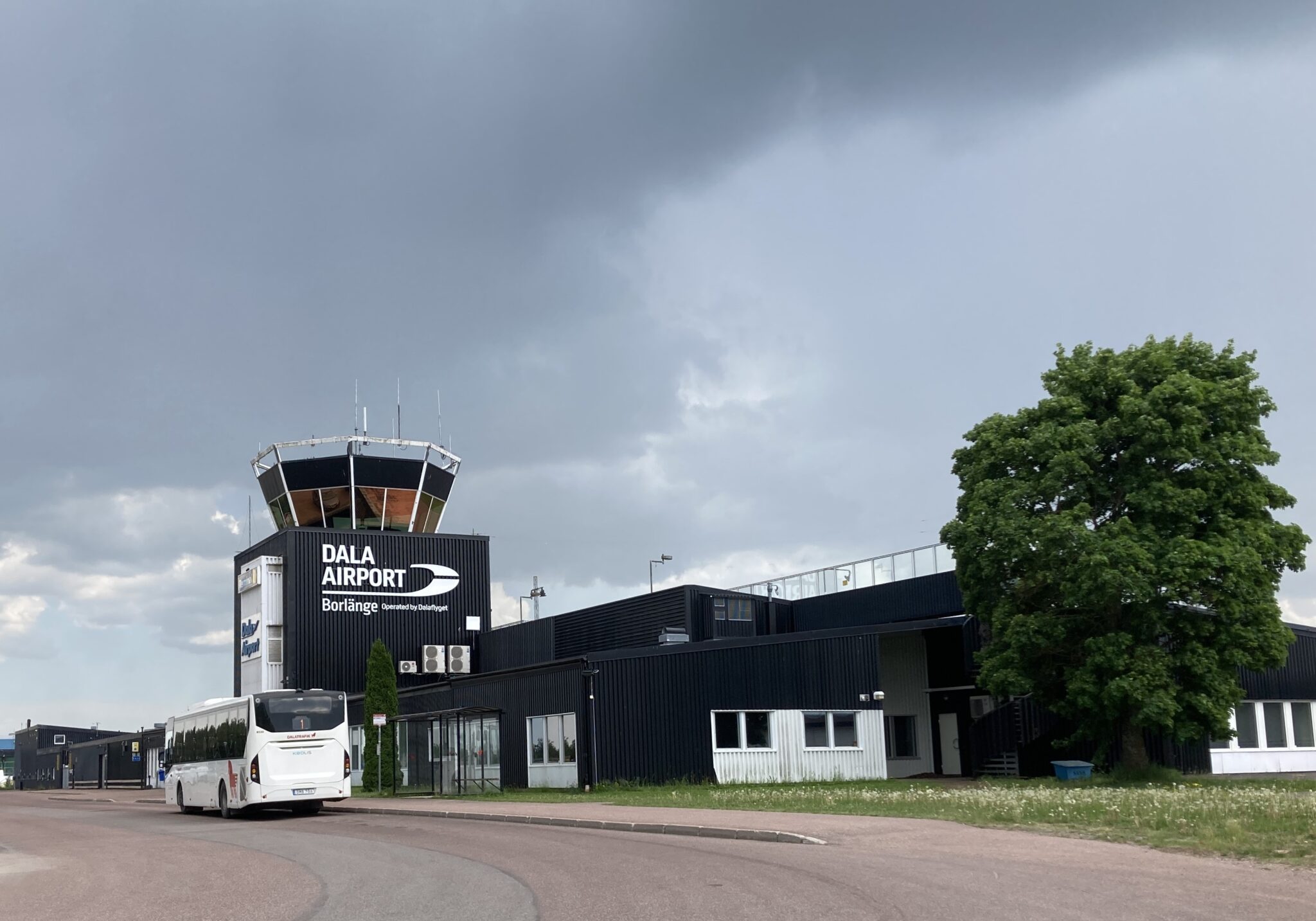 Flygledartornet på Dala Airport i Borlänge under mörka skyar. Foto: Richard Evers